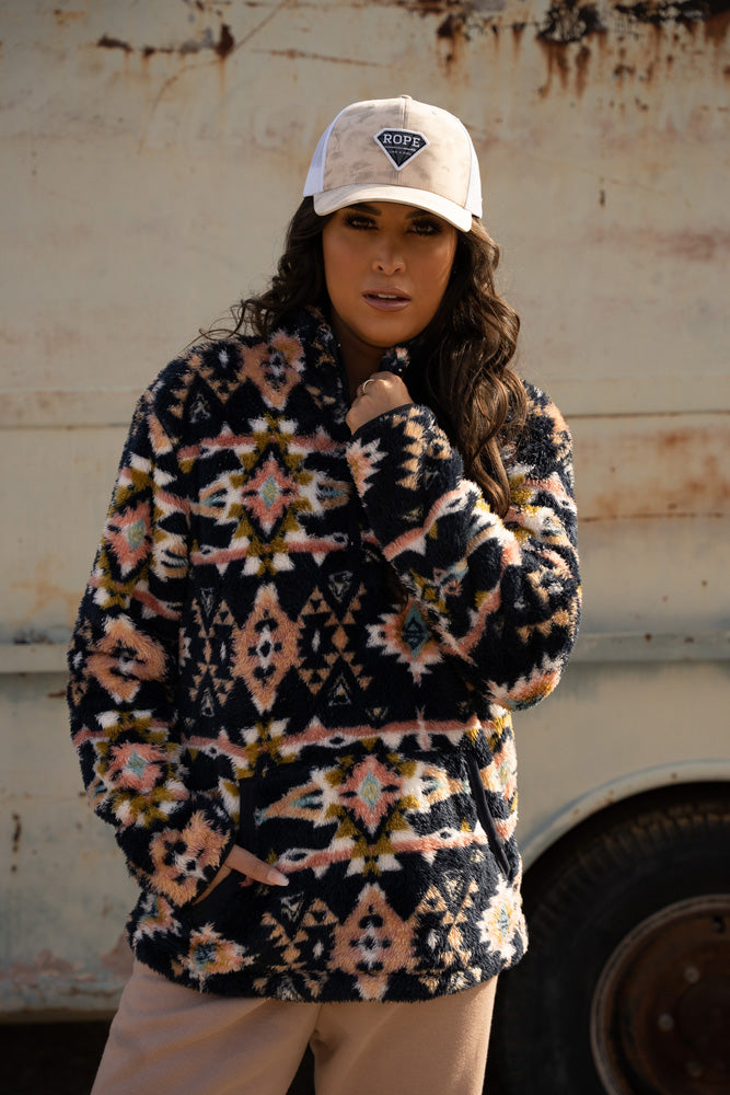 This navy with aztec fleece pullover by Hooey is super soft, and provides ultimate comfort during cold weather. Reinforced kangaroo pocket with 1/4 easy-zip construction on the zipper. Go with Hooey for your casual winter wear.